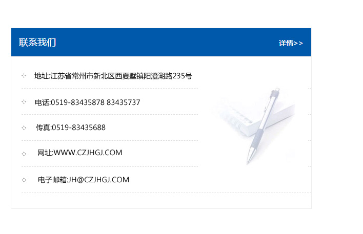 傳真:0519-83435688    郵編:213135    網(wǎng)址:WWW.czjhgj_com.rqtzgl.com    電子郵箱:JH@czjhgj_com.rqtzgl.com